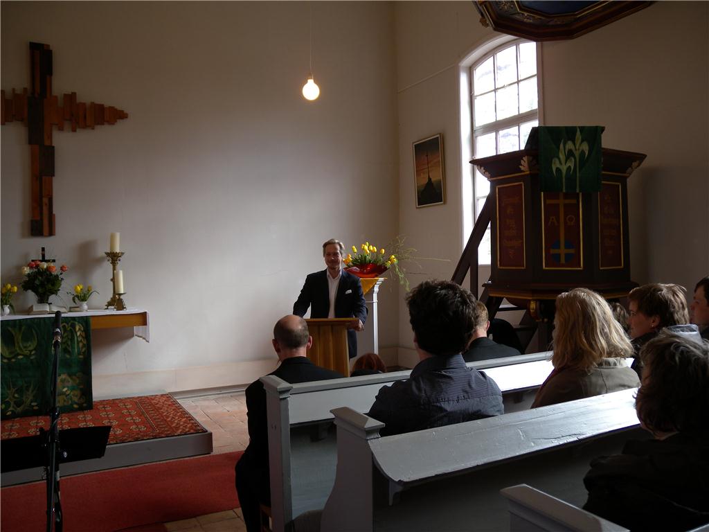 Die letzte Veranstaltung, ein Benefizkonzert der Kunst- und Musikschule Havelland am 1. Advent, was der Höhepunkt unseres Kulturkalenders 2013. Die im Kerzenlicht strahlende Kirche hätte nicht mehr Gäste aufnehmen können. Einige bekamen nur Stehplätze, 170 Köpfe wurden gezählt! Auch die Empore füllte sich, Parkmöglichkeiten im Dorf waren nahezu erschöpft. Wir waren bestens vorbereitet mit Kaffee, Kakao, Tee und wunderbaren Plätzchen, meisterhaft gebacken von Karina Sasse und Angie Majunke. Die Besucher, unter ihnen der Landtagsabgeordnete Udo Folgart, erfreuten sich der großartigen Darbietungen der 43 Musikschüler, die ihr Können in Gesang und auf Instrumenten bravourös präsentierten. Für Furore und heitere Gesichter sorgte die szenische Aufführung „Hänsel und Gretel“ zweier Nachwuchstalente. Landrat Dr. Burkhard Schröder las 3 spannende Weihnachtsgeschichten, denen Kinder wie Erwachsene aufmerksam lauschten. Am Rande übergab Brandenburgs Kultur-Staatssekretär Martin Gorholt symbolisch den Fördermittelbescheid für die Dachsanierung, wofür sich unser Verein eingesetzt hatte. Bürgermeister Holger Schreiber sprach über die großzügige finanzielle Hilfe der Gemeinde Wustermark für die Arbeiten an der Kirche, lobte die Aktivitäten, die unser Verein initiiert hat, und sagte weitere Unterstützung zu!